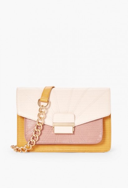 Material: Faux Leather Size: 9.5”L x 6.5”H x 3.5”D Hardware color: Gold Shoulder Strap : 22" Pockets: 1 interior pocket, 1 interior zip, 1 exterior pocket Closure: Push lock